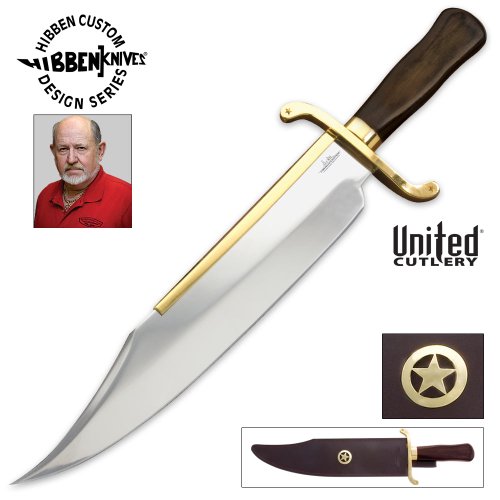Gil Hibben Old West Bowie KnifeThis elegant recreation offers a hardwood handle accented by the gold-plated blade catcher and guard, which are reminiscent of the styling of original Bowie. The classic 14" 420 Stainless steel blade features a crisp mirror finish. Includes a genuine leather sheath with brass-plated star. 20 1/2" overall.