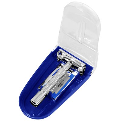 It is a perfect gift for both new and expert wet shavers! Item comes with a Dorco New Platinum ST300 stainless steel, double-edged razor blade and an attractive, clear plastic hard cover, blue re-usable storage holder with built-in mirror.